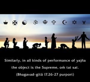 The words praśaste karmaṇi, or “prescribed duties,” indicate that there are many activities prescribed in the Vedic literature which are purificatory processes, beginning from the time of conception up to the end of one’s life. Such purificatory processes are adopted for the ultimate liberation of the living entity. In all such activities it is recommended that one vibrate oṁ tat sat. The words sad-bhāve and sādhu-bhāve indicate the transcendental situation. Acting in Kṛṣṇa consciousness is called sattva, and one who is fully conscious of the activities of Kṛṣṇa consciousness is called a sādhu. In the Śrīmad-Bhāgavatam (3.25.25) it is said that the transcendental subject matter becomes clear in the association of the devotees. The words used are satāṁ prasaṅgāt. Without good association, one cannot achieve transcendental knowledge. When initiating a person or offering the sacred thread, one vibrates the words oṁ tat sat. Similarly, in all kinds of performance of yajña the object is the Supreme, oṁ tat sat. The word tad-arthīyam further means offering service to anything which represents the Supreme, including such service as cooking and helping in the Lord’s temple, or any other kind of work for broadcasting the glories of the Lord. These supreme words oṁ tat sat are thus used in many ways to perfect all activities and make everything complete.