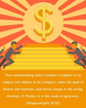 That understanding which considers irreligion to be religion and religion to be irreligion, under the spell of illusion and darkness, and strives always in the wrong direction, O Pārtha, is in the mode of ignorance.