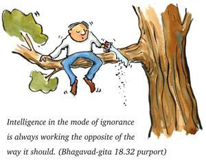 Intelligence in the mode of ignorance is always working the opposite of the way it should. It accepts religions which are not actually religions and rejects actual religion. Men in ignorance understand a great soul to be a common man and accept a common man as a great soul. They think truth to be untruth and accept untruth as truth. In all activities they simply take the wrong path; therefore their intelligence is in the mode of ignorance.