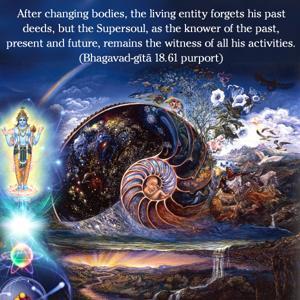 Arjuna was not the supreme knower, and his decision to fight or not to fight was confined to his limited discretion. Lord Kṛṣṇa instructed that the individual is not all in all. The Supreme Personality of Godhead, or He Himself, Kṛṣṇa, as the localized Supersoul, sits in the heart directing the living being. After changing bodies, the living entity forgets his past deeds, but the Supersoul, as the knower of the past, present and future, remains the witness of all his activities. Therefore all the activities of living entities are directed by this Supersoul. The living entity gets what he deserves and is carried by the material body, which is created in the material energy under the direction of the Supersoul. As soon as a living entity is placed in a particular type of body, he has to work under the spell of that bodily situation. A person seated in a high-speed motorcar goes faster than one seated in a slower car, though the living entities, the drivers, may be the same. Similarly, by the order of the Supreme Soul, material nature fashions a particular type of body to a particular type of living entity so that he may work according to his past desires. The living entity is not independent. One should not think himself independent of the Supreme Personality of Godhead. The individual is always under the Lord’s control. Therefore one’s duty is to surrender, and that is the injunction of the next verse.