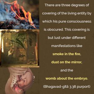 There are three degrees of covering of the living entity by which his pure consciousness is obscured. This covering is but lust under different manifestations like smoke in the fire, dust on the mirror, and the womb about the embryo. When lust is compared to smoke, it is understood that the fire of the living spark can be a little perceived. In other words, when the living entity exhibits his Kṛṣṇa consciousness slightly, he may be likened to the fire covered by smoke. Although fire is necessary where there is smoke, there is no overt manifestation of fire in the early stage. This stage is like the beginning of Kṛṣṇa consciousness. The dust on the mirror refers to a cleansing process of the mirror of the mind by so many spiritual methods. The best process is to chant the holy names of the Lord. The embryo covered by the womb is an analogy illustrating a helpless position, for the child in the womb is so helpless that he cannot even move. This stage of living condition can be compared to that of the trees. The trees are also living entities, but they have been put in such a condition of life by such a great exhibition of lust that they are almost void of all consciousness. The covered mirror is compared to the birds and beasts, and the smoke-covered fire is compared to the human being. In the form of a human being, the living entity may revive a little Kṛṣṇa consciousness, and, if he makes further development, the fire of spiritual life can be kindled in the human form of life. By careful handling of the smoke in the fire, fire can be made to blaze. Therefore the human form of life is a chance for the living entity to escape the entanglement of material existence. In the human form of life, one can conquer the enemy, lust, by cultivation of Kṛṣṇa consciousness under able guidance.