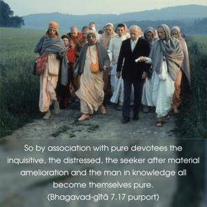 Free from all contaminations of material desires, the distressed, the inquisitive, the penniless and the seeker after supreme knowledge can all become pure devotees. But out of them, he who is in knowledge of the Absolute Truth and free from all material desires becomes a really pure devotee of the Lord. And of the four orders, the devotee who is in full knowledge and is at the same time engaged in devotional service is, the Lord says, the best. By searching after knowledge one realizes that his self is different from his material body, and when further advanced he comes to the knowledge of impersonal Brahman and Paramātmā. When one is fully purified, he realizes that his constitutional position is to be the eternal servant of God. So by association with pure devotees the inquisitive, the distressed, the seeker after material amelioration and the man in knowledge all become themselves pure. But in the preparatory stage, the man who is in full knowledge of the Supreme Lord and is at the same time executing devotional service is very dear to the Lord. He who is situated in pure knowledge of the transcendence of the Supreme Personality of God is so protected in devotional service that material contamination cannot touch him.