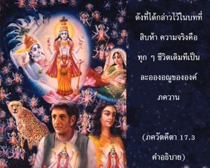 ทุกคนมีความศรัทธาบางอย่างไม่ว่าจะเป็นใคร แต่ความศรัทธาพิจารณาว่าอยู่ในความดี ตัณหา หรืออวิชชา ตามธรรมชาติที่ตนได้รับมา ดังนั้นตามความศรัทธาโดยเฉพาะนี้เราจึงมาคบหากับบุคคลบางประเภทดังที่ได้กล่าวไว้ในบทที่สิบห้า ความจริงคือทุกๆชีวิตเดิมทีเป็นละอองอณูขององค์ภควานฺ ฉะนั้นเดิมทีตัวเราเป็นทิพย์อยู่เหนือระดับแห่งธรรมชาติวัตถุทั้งหลาย แต่เมื่อลืมความสัมพันธ์กับบุคลิกภาพสูงสุดแห่งพระเจ้า และมาสัมผัสกับธรรมชาติวัตถุในพันธชีวิต เขาสร้างจุดยืนของตัวเองด้วยการมาคบหาสมาคมกับธรรมชาติวัตถุระดับต่างๆ ผลแห่งความศรัทธาและความเป็นอยู่ที่ผิดธรรมชาติเป็นเพียงวัตถุเท่านั้น ถึงแม้อาจปฏิบัติตามความรู้สึกว่าประทับใจบางอย่างหรือตามแนวคิดชีวิตบางอย่าง เดิมทีตัวเราเป็น นิรฺคุณ หรือเป็นทิพย์ ดังนั้นเราต้องชะล้างมลทินทางวัตถุที่ครอบงำตัวเราเพื่อจะได้รับความสัมพันธ์ที่มีต่อองค์ภควานฺกลับคืนมา ซึ่งเป็นวิถีทางเดียวที่จะกลับคืนไปโดยไม่มีความกลัว และนั่นคือกฺฤษฺณจิตสำนึก หากสถิตในกฺฤษฺณจิตสำนึกวิถีทางนี้รับประกันได้ในการพัฒนาไปสู่ระดับแห่งความสมบูรณ์ หากเราไม่ปฏิบัติตามวิธีเพื่อการรู้แจ้งแห่งตนนี้แน่นอนว่าเราจะต้องประพฤติตนภายใต้อิทธิพลของระดับต่างๆแห่งธรรมชาติ
