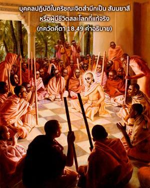 การเสียสละที่แท้จริงหมายความว่า เราควรคิดอยู่เสมอว่าตนเองเป็นละอองอณูขององค์ภควานฺ ดังนั้นจึงคิดว่าไม่มีสิทธิ์จะรื่นเริงกับผลงานของตน เนื่องจากเป็นละอองอณูขององค์ภควานฺผลงานของเราต้องถวายให้พระองค์รื่นเริง นี่คือกฺฤษฺณจิตสำนึกที่แท้จริง บุคคลปฏิบัติในกฺฤษฺณจิตสำนึกเป็น สนฺนฺยาสี หรือผู้มีชีวิตสละโลกที่แท้จริง ด้วยความคิดเช่นนี้เราจึงมีความพึงพอใจเพราะว่าเราปฏิบัติเพื่อองค์ภควานฺโดยแท้จริง ดังนั้นจึงไม่ยึดติดกับสิ่งใดๆที่เป็นวัตถุ เราจะเคยชินกับการไม่หาความสุขกับสิ่งใดที่นอกเหนือจากความสุขทิพย์ซึ่งได้รับจากการรับใช้พระองค์ สนฺนฺยาสี ควรเป็นอิสระจากผลกรรมจากกรรมในอดีตของตน แต่บุคคลในกฺฤษฺณจิตสำนึกบรรลุถึงความสมบูรณ์โดยปริยายโดยไม่ต้องอุปสมบทในระดับที่สมมติว่าเป็นชีวิตสละโลก ระดับจิตเช่นนี้เรียกว่า โยคารูฒ หรือระดับสมบูรณ์แห่งโยคะ ดังที่ได้ยืนยันไว้ในบทที่สามว่า ยสฺ ตฺวฺ อาตฺม-รติรฺ เอว สฺยาตฺ เป็นผู้ที่มีความพึงพอใจในตนเอง และไม่มีความกลัวต่อผลกรรมใดๆจากการกระทำของตนเอง