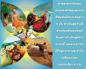 องค์ภควานฺทรงเป็นผู้สร้างทุกสิ่งทุกอย่าง ทุกสิ่งทุกอย่างกำเนิดมาจากพระองค์ พระองค์ทรงค้ำจุนทุกสิ่งทุกอย่าง และหลังจากการทำลายล้างทุกสิ่งทุกอย่างจะพำนักอยู่ในพระองค์ ฉะนั้นองค์ภควานฺทรงเป็นผู้สร้างสี่ส่วนของสังคมมนุษย์ เริ่มจากระดับมนุษย์ผู้มีปัญญาเรียกทางเทคนิคว่า พฺราหฺมณ หรือพราหมณ์ เนื่องจากสถิตในระดับแห่งความดี ถัดไปเป็นระดับบริหารเรียกทางเทคนิคว่า กฺษตฺริย หรือกษัตริย์ เนื่องจากสถิตในระดับแห่งตัณหา พ่อค้าวาณิชหรือ ไวศฺย สถิตในระดับผสมผสานระหว่างตัณหาและอวิชชา และ ศูทฺร หรือระดับใช้แรงงานสถิตในระดับอวิชชาของธรรมชาติวัตถุ ถึงแม้ว่าองค์ศฺรี กฺฤษฺณทรงเป็นผู้สร้างสี่ส่วนของสังคมมนุษย์ แต่พระองค์ทรงมิได้อยู่ในส่วนใดส่วนหนึ่ง เนื่องจากพระองค์ทรงมิได้เป็นพันธวิญญาณที่อยู่ในส่วนใดส่วนหนึ่งของสังคมมนุษย์ สังคมมนุษย์นั้นคล้ายกับสังคมสัตว์ทั่วไป แต่เพื่อยกระดับสภาพความเป็นสัตว์พระองค์จึงทรงสร้างการแบ่งส่วนเพื่อพัฒนากฺฤษฺณจิตสำนึกอย่างเป็นระบบ นิสัยชอบหรือถนัดในเรื่องการทำงานขึ้นอยู่กับระดับของธรรมชาติวัตถุที่ตนได้รับ ลักษณะอาการของชีวิตตามระดับต่างๆของธรรมชาติวัตถุจะอธิบายในบทที่สิบแปดของหนังสือเล่มนี้ อย่างไรก็ดีบุคคลในกฺฤษฺณจิตสำนึกอยู่เหนือแม้แต่ พฺราหฺมณ แม้โดยคุณสมบัติ พฺราหฺมณ ควรทราบเกี่ยวกับ พฺรหฺมนฺ หรือสัจธรรมสูงสุดแต่ส่วนใหญ่พวก พฺราหฺมณ จะเข้าหา พฺรหฺมนฺ อันไร้รูปลักษณ์ขององค์กฺฤษฺณเท่านั้น แต่ผู้ที่ข้ามพ้นขีดจำกัดแห่งความรู้ของ พฺราหฺมณ และบรรลุถึงความรู้แห่งบุคลิกภาพสูงสุดแห่งพระเจ้าองค์ศฺรี กฺฤษฺณจะมาเป็นบุคคลในกฺฤษฺณจิตสำนึก หรือ ไวษฺณว กฺฤษฺณจิตสำนึกจะรวมถึงความรู้แห่งองค์อวตารทั้งหลายขององค์กฺฤษฺณ เช่น พระราม นฺฤสึห , วราห ฯลฯ ในฐานะที่องค์กฺฤษฺณทรงเป็นทิพย์อยู่เหนือระบบสี่ส่วนแห่งสังคมมนุษย์นี้บุคคลในกฺฤษฺณจิตสำนึกก็อยู่เหนือการแบ่งส่วนทั้งหลายในสังคมมนุษย์ ไม่ว่าจะเป็นการแบ่งส่วนในระดับกลุ่มชน ระดับชาติ หรือระดับเผ่าพันธุ์